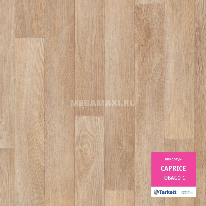Линолеум бытовой усиленныйТаркетт Каприз Тобаго 1 - одно из лучших напольных покрытий. Изящность, утонченность и высокое качество - основные достоинства данного линолеума. Нежный серо-коричневый оттенок дизайна линолеума, колоритная эксплицитность рисунка дерева и рельефная текстура делают покрытие очень схожим с дорогой паркетной доской.